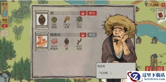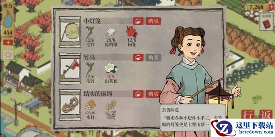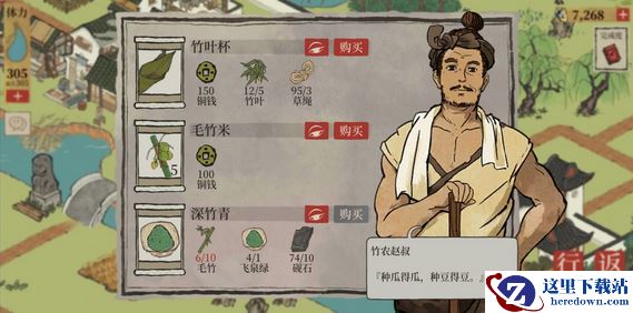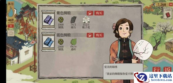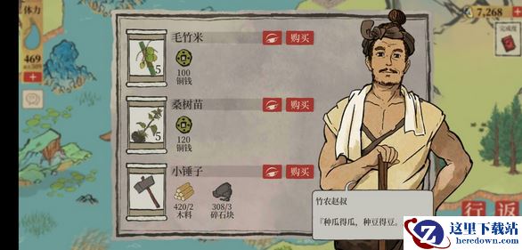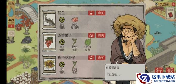 店铺售卖:毛竹米、桑树苗、小锤子;活鱼、芳香果子、栀子花种子;紫色绸缎、蓝色绸缎