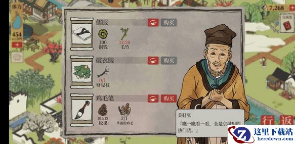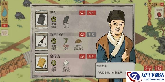 店铺售卖:酒、烟熏肉;竹叶杯、毛竹米、深竹青;砚台、简易毛笔、金花笺;松烟墨、桃红、飞泉绿。