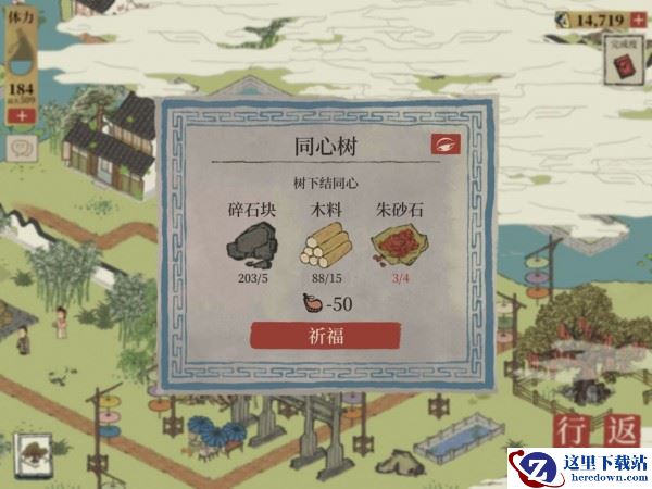 在三棵同心树上获取同心纸(碎石块×5,木料×15,朱砂石×4,体力-50)