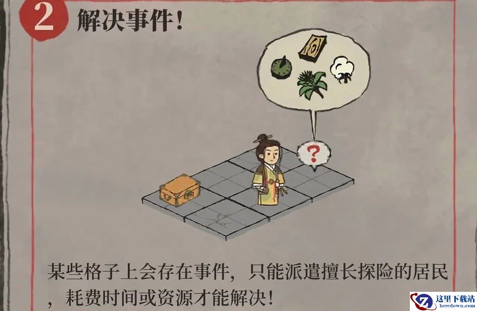 玩家在移动的时候,某些格子上会存在随机事件事件,这些事件会消耗玩家的物资或者时间,需要玩家派遣一些擅长探险的居民耗费时间或资源才能解决。