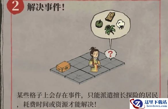 某些格子上会存在事件,只能派遣擅长探险的居民耗费时间或资源才能解决。