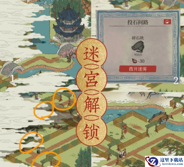迷宫解锁:在地图左上方的位置有一个戏园和一个听琴台,从这个小桥进去,盲点竹栅栏门,点到后会有一个“投石问路”,交付所需物资就可以解锁一小片迷雾。这个迷宫由无数块迷雾遮挡着。依次点竹栅栏的门,交付就所需物资可以解锁了。当你解锁迷宫里所有的迷雾时,你会发现只有地图最左上角那一小块迷雾无法通过“投石问路”解锁。