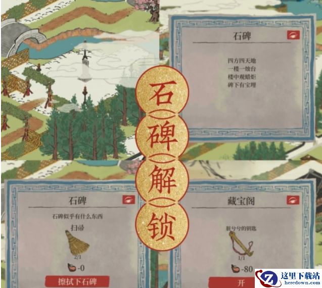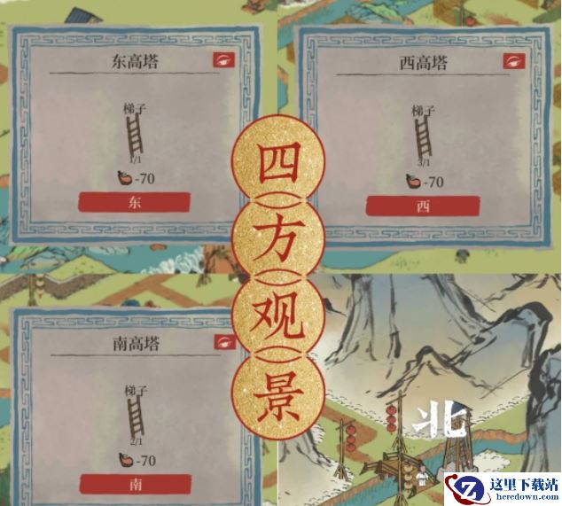 3、我们根据图中所示,能在地图的东南西北4个方位分别找到一个高塔,登上高塔所需要的竹梯在前面任务中有制作。登上4个高塔后再回到石碑的位置,会有一个扫帚让你打扫一下石碑。