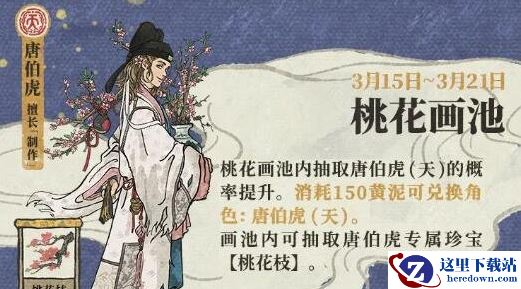 3月15日11:00至3月21日23:59,【桃花画池】开启!天级居民【唐伯虎】概率提升;