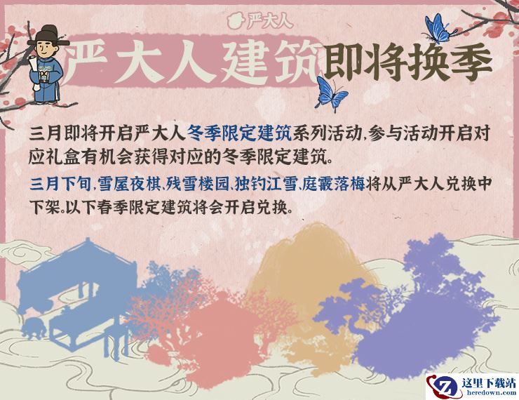 三月已开启严大人冬季限定建筑系列活动,参与活动即有机会获得冬季建筑;三月下旬冬季建筑将从严大人下架,同时春季限定建筑将会开启兑换。