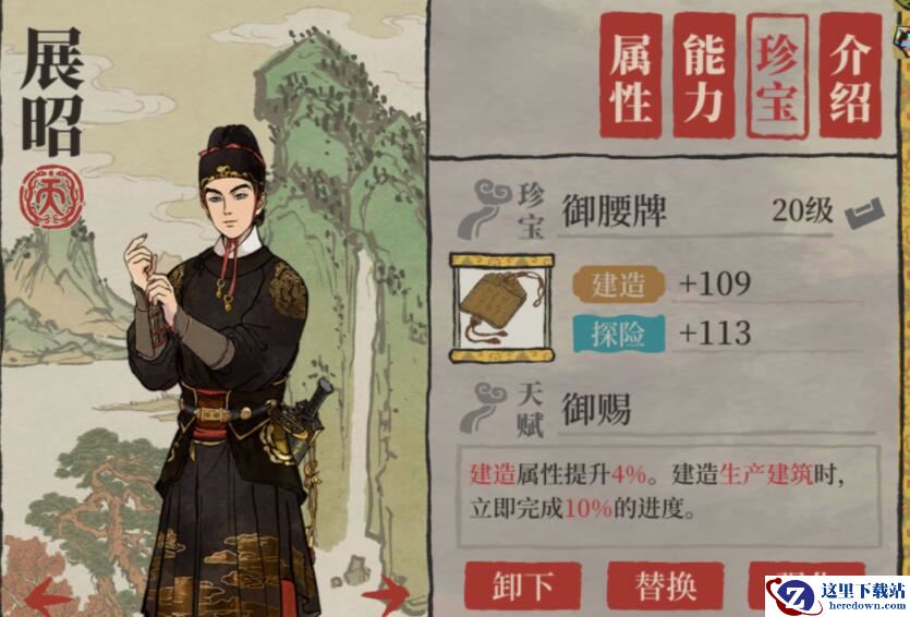 展昭装备时建造属性提升4%。建造生产建筑时,立即完成10%的进度。
