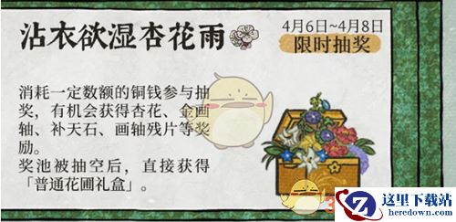 消耗定数额的铜钱参与抽奖,有机会获得杏花、金画轴、补天石、画轴残片等奖励。