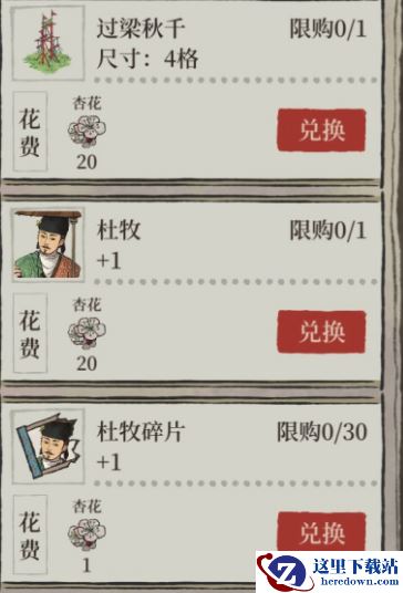 杏花目前可以兑换过梁秋千,候级角色杜牧、杜牧碎片、金画轴、画泥。
