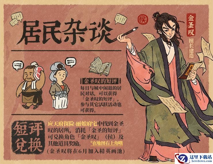 5月1日-5月26日,在“应天府探险-丽娘府宅”中找到金圣叹居所,可消耗【金圣叹的短评】*20兑换侯级居民【金圣叹】及其他奖励。【金圣叹】将于6月进入精英画池。