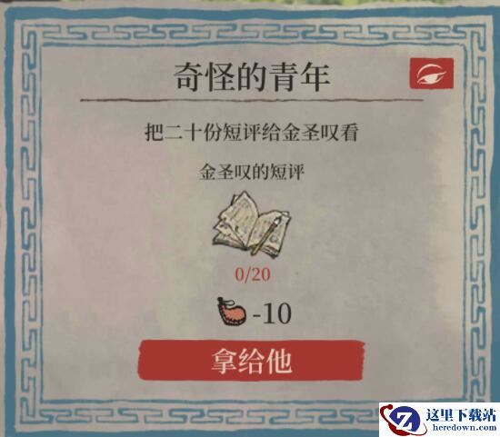 以上就是小编整理的江南百景图金圣叹的短评任务攻略的全部内容了,想知道更多相关资讯攻略的请关注手游网。