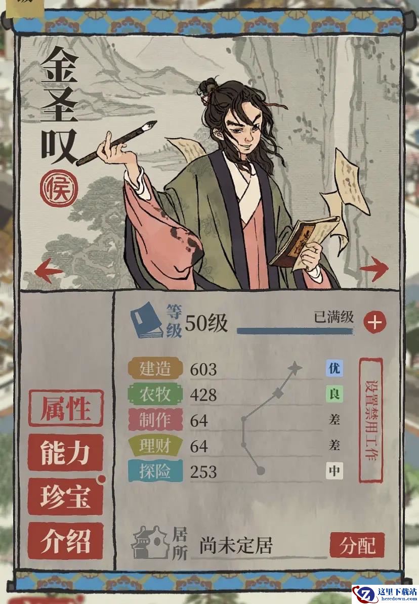 满级属性:建造603,农牧428,制作64,理财64,探险253