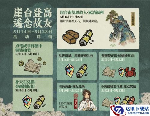 5月16日-5月22日,【崖台南望思故人】累消福利开启。累计消耗补天石,即可领取 黄泥、金画轴、崖松辞青 等奖励;