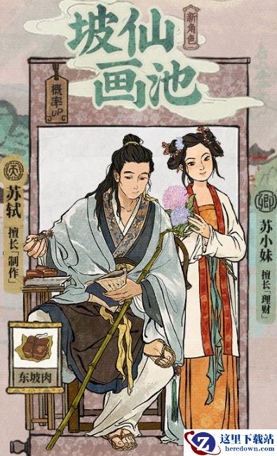 6月5日-6月29日,【坡仙画池】开启。天级新角色【苏轼】& 卿级新角色【苏小妹】共同进入该画池,其中天级居民【苏轼】及其专属珍宝【东坡肉】概率提升。