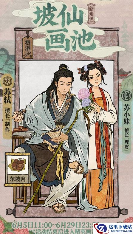6月5日-6月29日,【坡仙画池】开启。天级新角色【苏轼】进入该画池,天级居民【苏轼】及其专属珍宝【东坡肉】概率提升。活动结束后【苏轼】进入【精英】画池。