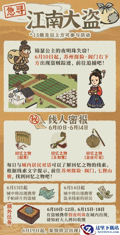 此外6月10日至6月12日及6月15日至6月18日,城内会有盗贼携带【假夜明珠】混淆视听、掩护同伙,还请知府大人一并收缴拷问。