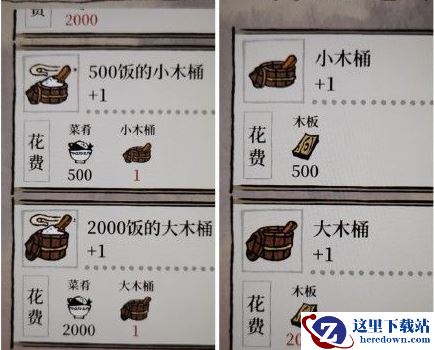 五百木板换小木桶,小木桶+五百饭换小饭桶;