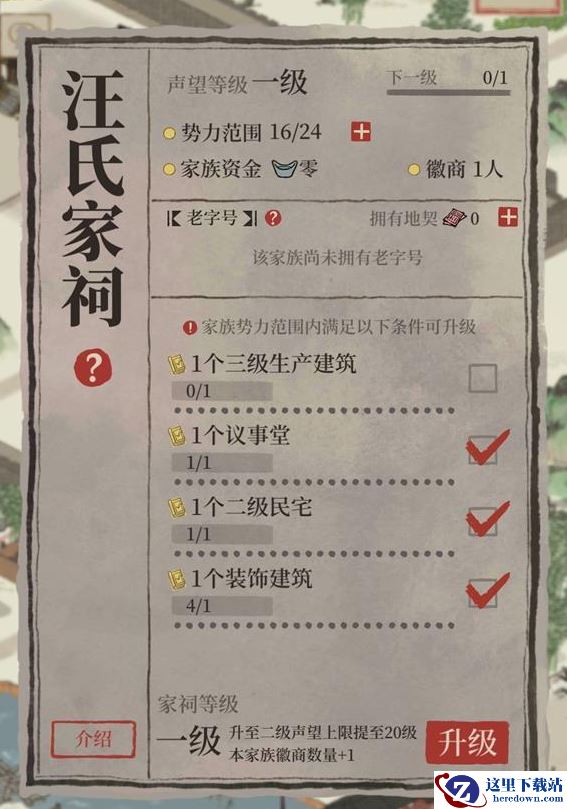 家族祠堂升级,按照要求摆放相应的建筑可以升级,你可以理解为商栈组合模式与衙门升级门槛。升级提高声望上限,然后加一个徽商。家族势力范围在祠堂地面有标记。通过交易获取铜板金箔家族资金,交易量达到一定累积数量可以达成垄断解锁娱乐建筑。