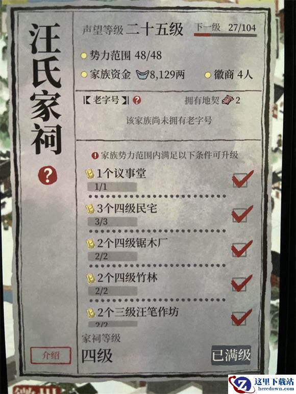 注意:摆放不当或移动家祠导致的家祠降级,降后等级数=徽商可用人数,不可用徽商显示停职观察,家祠等级恢复后可用。