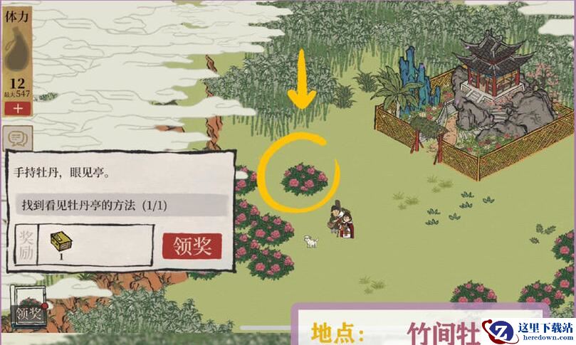3、出现牡丹亭之后,需要选择,大家按照下图的顺序选择,西西边,南南边,西边,即可成功完成任务。