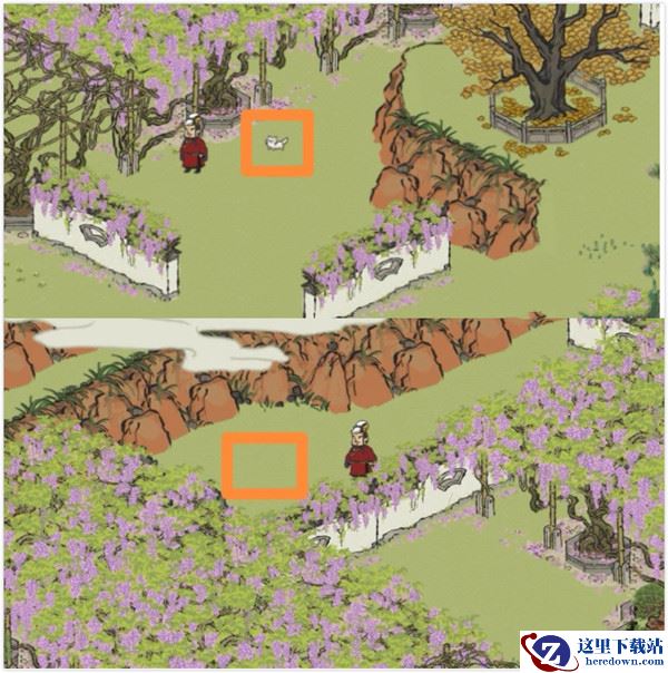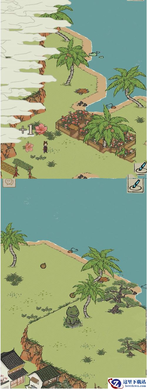 7、北边的小岛上(就是全是椰子树的小岛)有猫猫,抱走之后,岛上有张择端的桃花树,放上猫猫有一个金画轴