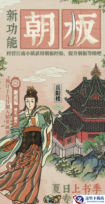 付费购买【象简】权益,提升朝板经验即可解锁专属奖励:全新侯级居民【谢道韫】(预计将在9月进入精英画池)、全新建筑【岳阳楼】。