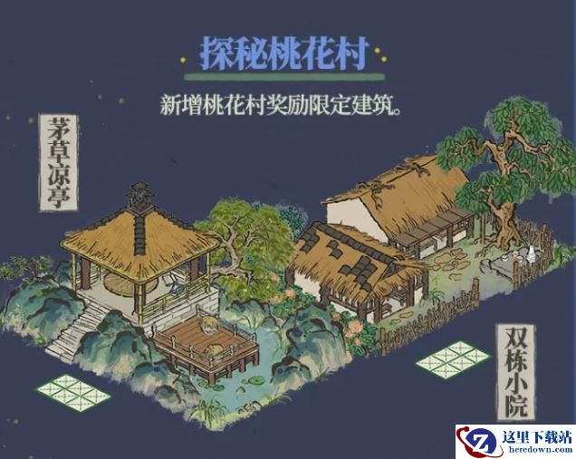 新增桃花村奖励限定建筑:茅草凉亭和双栋小院。