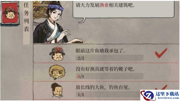 1、在鸡鸣山的建设任务中,玩家需要按照任务要求来建设渔业建筑,满足这一要求的建筑有三种,分别是鱼塘、渔具店、钓鱼台。