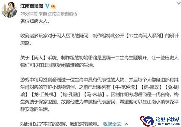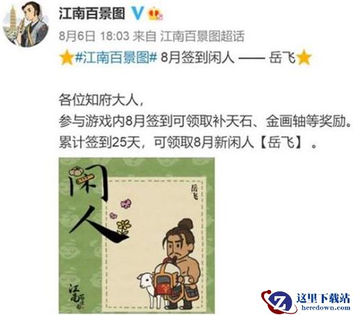 江南百景图岳飞是官方最新公开上线的一位“闲人”,但对应的宣传图却有了一名莫名的意味,具体如图:
