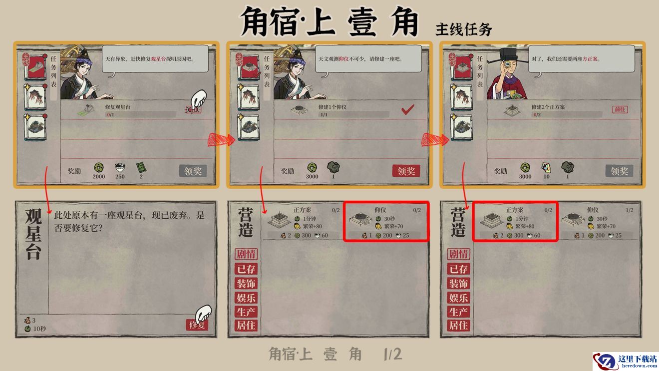 主线这里只需要建造一个仰仪,但营造-剧情处是能建两个仰仪的。出于节省资源的目的,建议建一个就行。