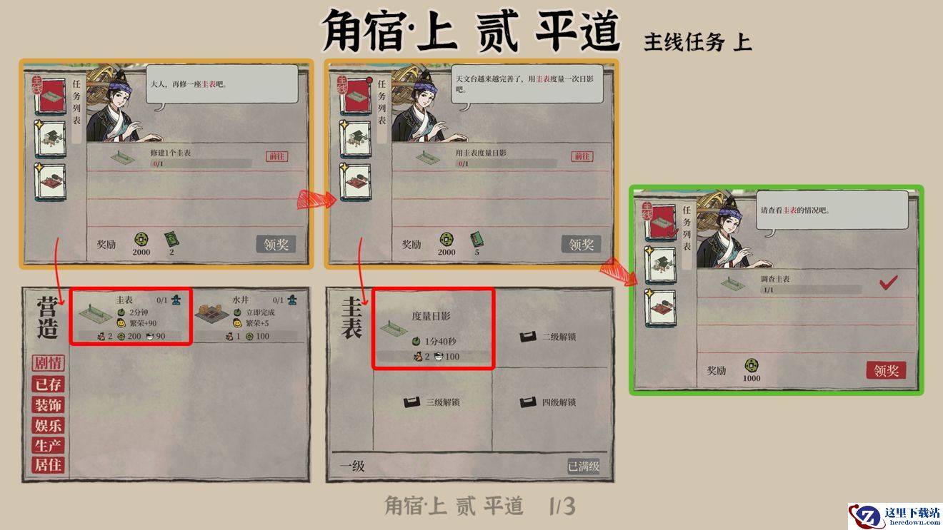 主线方面根据要求建造即可,依次建造圭表、度量日影、水井和石头路灯即可完成主线。