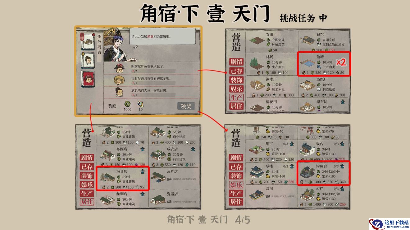 猜谜一样的建造任务是建造鱼塘、渔具店和钓鱼台。