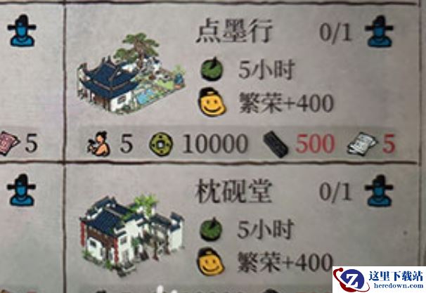 4、下面是江南百景图点墨行建造的具体所需材料,大家可以了解一下吧。