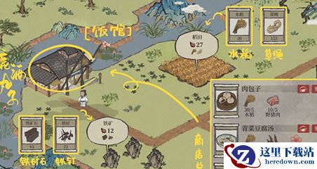 在如图所示的饭馆这里即可兑换肉包子,需要耗费5个水稻、5个野猪肉。另外告诉大家一个技巧,就是土地公所在的地方,一般这个图里面都可以找到兑换物品;
