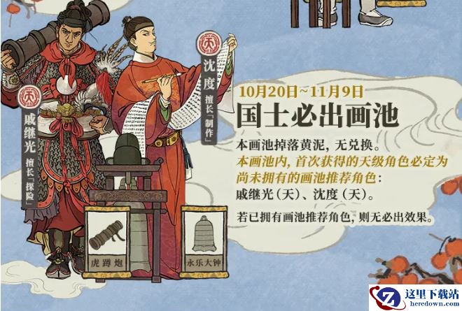 【戚继光】、【沈度】概率提升。画池内首次获得的天级居民必为尚未拥有的专属up角色。若均已拥有,则无必出效果。