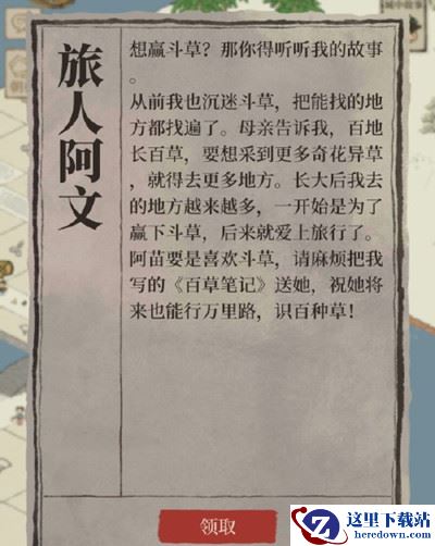 1、玩家读完旅人阿文发过来的一封信得知,阿文曾经也喜欢斗草。