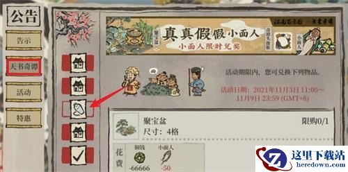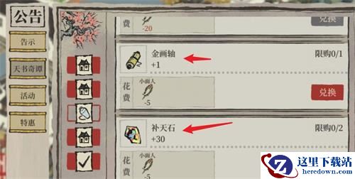 2.5个小面人可以兑换一个【金画轴】,限购一个。5个小面人可以兑换30补天石,限购二次。