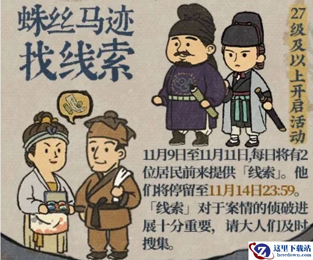 此外,11月9日至11月11日,每日还会有2位居民前来提供【线索】,他们将停留至11月14日23:59。收集【线索】和【铅银袋子】解锁【明察暗访辨真伪】的最终剧情。