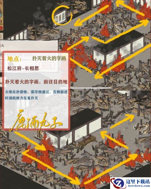 注:火堆反扑很快,需尽快通过,否则前进时消耗体力反复扑灭
