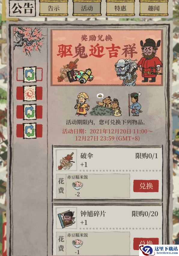 在“驱鬼迎吉祥”兑换界面(12月28日0点关闭)兑换全部奖励需要【51个赤豆糯米饭】
