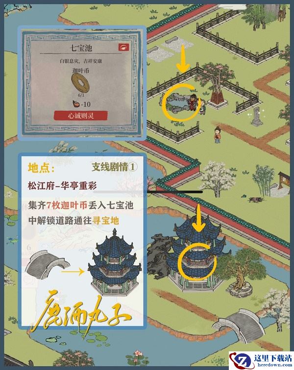 [集齐7枚迦叶币丢入七宝池,即可解锁通往寻宝地的道路]