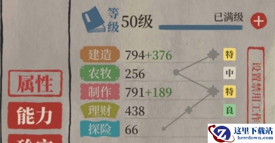 满级属性:建造808,农牧260,制作803,理财444,探险68