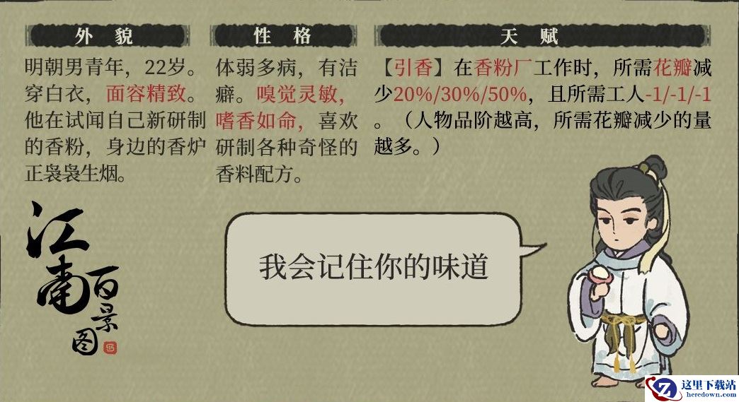 【引香】在香粉厂工作时,所需花瓣减少20%/30%/50%,且所需工人-1/-1/-1□。(人物品阶越高,所需花瓣减少的量越多。)