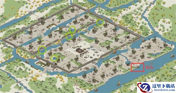 从城市中心向右划到大运河即可看到,另外五个圈圈是产出芡实的地方,每22小时至少产出1芡实,运气好的话一处可以产出2-3个芡实。
