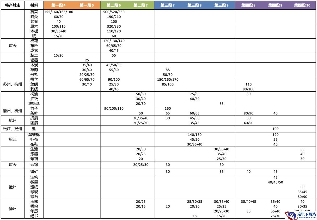 第三段 新增铁矿、盐、黑核棉、标布、布鞋、年历、经书等,但第一段的基础资源无