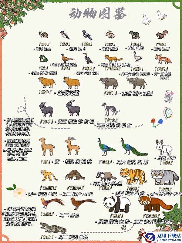 2.玩家们可以按照图片上所标示的位置时间信息进行抓捕,不同的动物有不同的出现时间和地点。