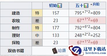 初始属性:建造157,农牧23,制作177,理财133,探险23。