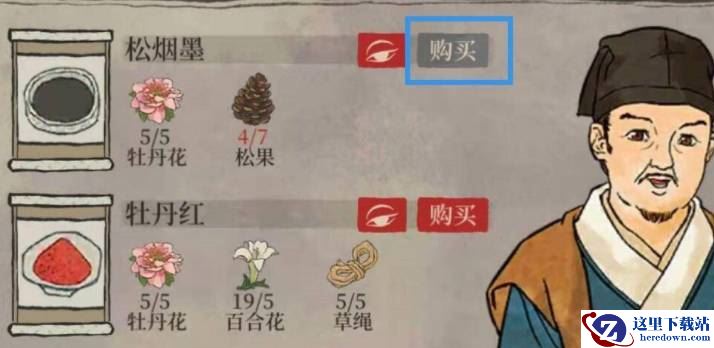 4、点击后我们就可以看到松烟墨的兑换购买页面了,需要我们使用牡丹花5个,松果7个去进行购买。