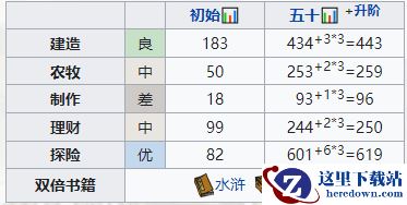 初始属性:建造183,农牧50,制作18,理财99,探险82。