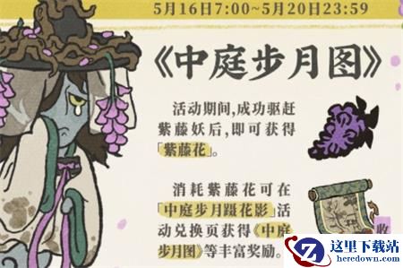 中庭步月图是需要用紫藤花兑换获取的,所以玩家要先获得紫藤花。