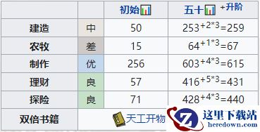 初始属性:建造50,农牧15,制作256,理财57,探险71。